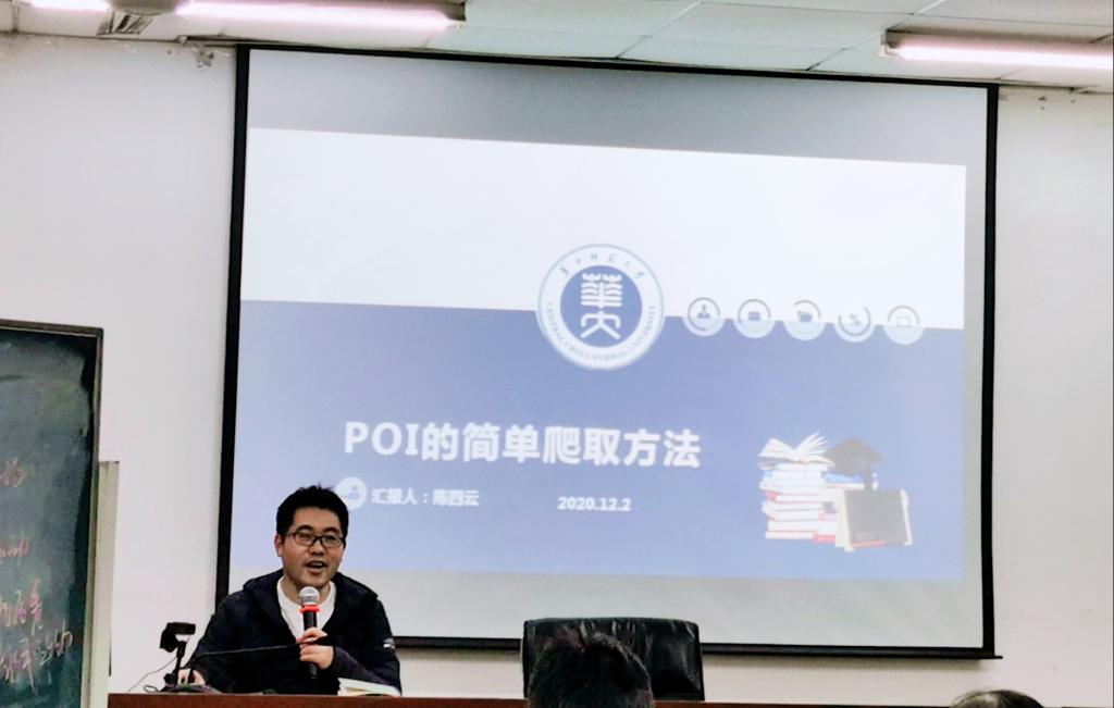 第一阶段,博士生嘉宾依次汇报近期研究进展。陈四云博士分享了题为“POI的简单爬取方法”的报告,报告中详细介绍了如何在OSpider v3.0.0软件中获取百度地图的Key的基本操作流程,分享了相关软件的学习网站,并指出利用该软件获取数据还存在数据不全、数据重复及属性不全等问题。