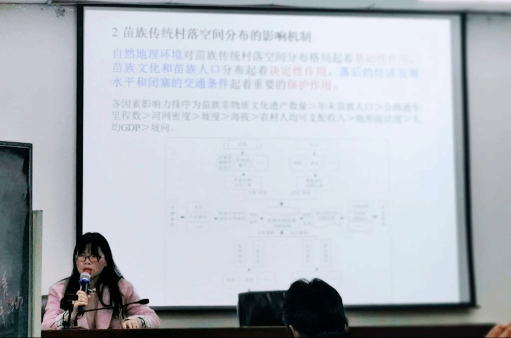 杨燕博士作了题为“贵州省苗族传统村落空间结构识别及影响机制研究”的报告,她指出贵州省苗族传统村落的空间分布具有集台性、向坡性、沿河流等指向性分布特征,同时阐释了自然地理环境对苗族传统村落空间分布起着基础性作用,苗族文化和苗族人口分布起着决定性作用,落后的经济发展水平和闭塞的交通条件起着重要的保护作用,且这些因素对苗族传统村落空间分布有着不同程度的影响。