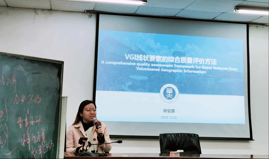 林安琪博士分享了题为“VGI线状要素的综合质量评价方法”的报告,她介绍了研究过程中的数据网格处理、几何指标与拓扑指标的计算、VGI线状要素质量评价模型,指出盒维数与线精度评价指标的联合应用,可以降低使用单个指标产生的不确定性,从而提高数据质量评价的精确性。