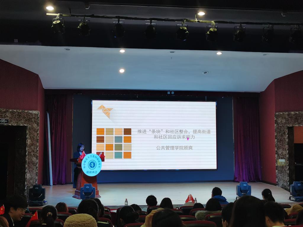 首先,全体师生起立,齐唱国歌。接着,由主持人对“模拟两会”决赛比赛规则进行介绍。经过初赛海选,评审组委会筛选出10份提案最终进入决赛。10组参赛队伍按照事先抽取的出场顺序上台进行发言,向台下代表委员及评委陈述自己的提案。陈述结束后按照赛前抽签两两分组的结果,以模拟记者团的形式就对方提案中问题设计的可靠性、解决方式的有效性等任意方面进行质询,再由老师进行提问与点评。