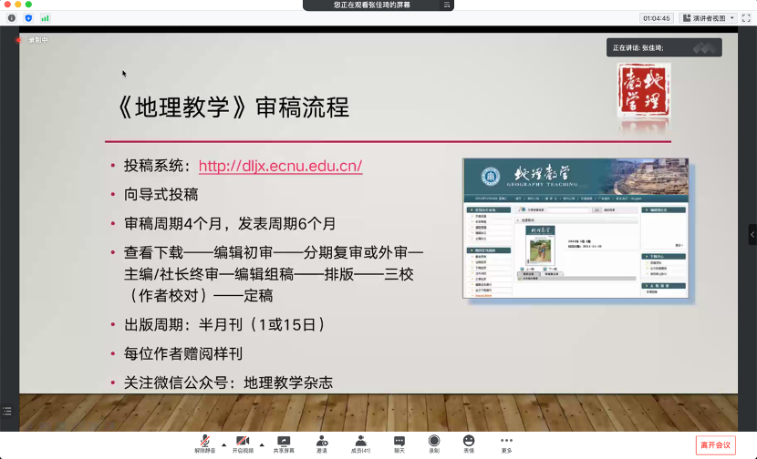 最后,张佳琦老师以《地理教学》杂志为例,向同学们清晰介绍了地理科研论文的投稿策略,并针对《地理教学》杂志的主要栏目和审稿流程进行了说明,张老师指出论文撰写要尽量参考目标期刊的格式要求和主题倾向,做到“向导式投稿”,注重论文写作的规范性与科学性,提高投稿的成功率。