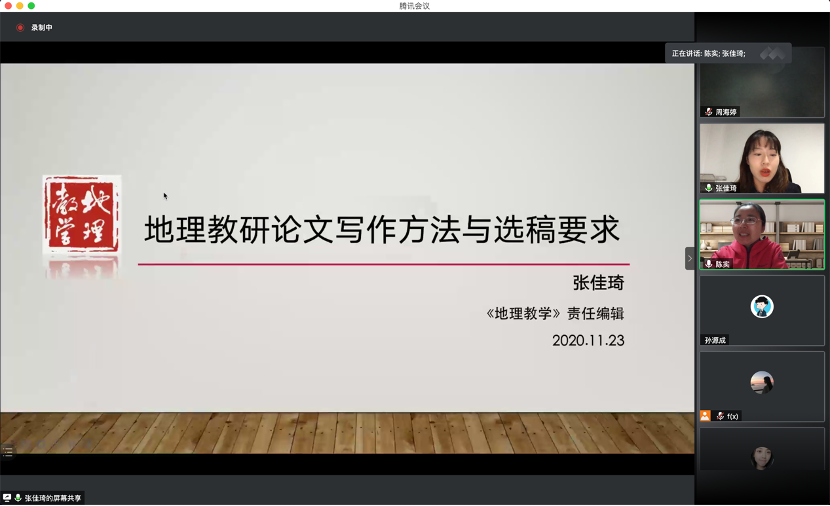 (通讯员:孙源成)2020年11月23日(星期一)18时30分,“地理教研论文写作方法与选稿要求”学术讲座以腾讯会议线上形式成功举办。本次学术讲座由《地理教学》杂志责任编辑张佳琦老师担任主讲,由城市与环境科学学院陈实教授主持,城环学院众多研究生在线同步聆听学习。张佳琦老师从以下三个方面展开讲座内容: