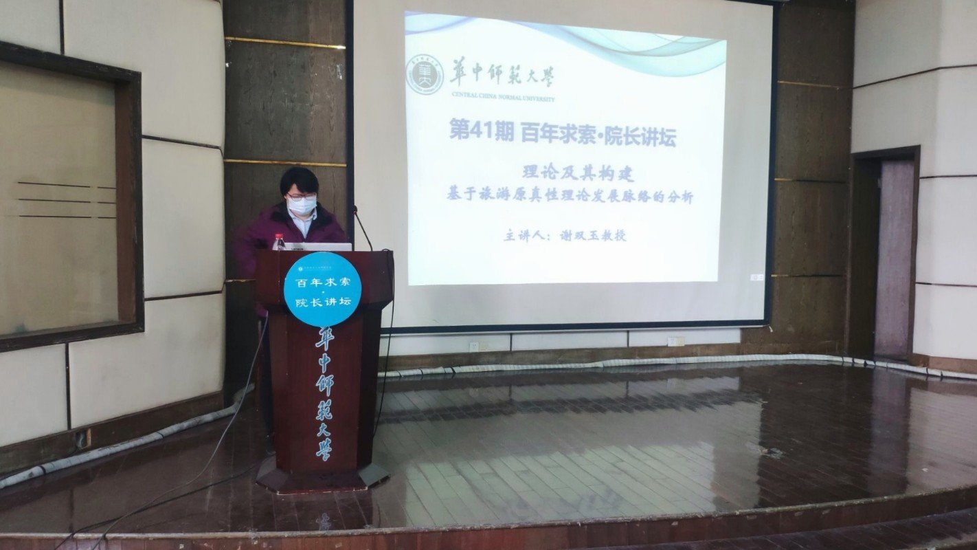 (通讯员:李宇晟)2020年11月15日(星期日)下午3点,百年求索·院长讲坛(第41期)“理论及其构建——基于旅游原真性理论发展脉络的分析”报告会在9号楼1楼报告厅成功举办。本次院长讲坛原定由城市与环境科学学院副院长谢双玉教授主讲,由于谢双玉教授因故未能来到现场,故此次讲坛由城市与环境科学学院程绍文副教授代为讲授。本次讲坛由城市与环境科学学院研究生会的杨会婷同学主持,有来自学院的多名老师及学生到场聆听、学习。讲坛共分为两个阶段进行: