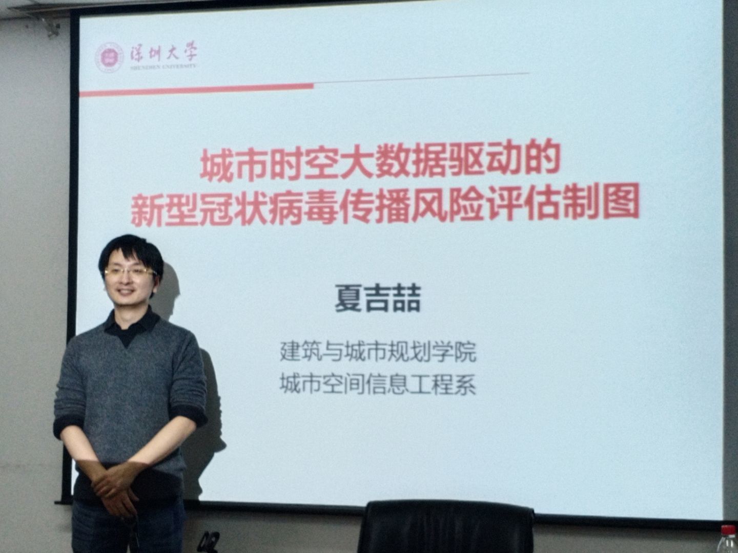 (通讯员:覃愉)2020年10月6日(星期二)下午4点,由城市与环境科学学院研究生会主办,生命科学学院研究生会协办的“城市时空大数据驱动的新型冠状病毒传播风险评估制图”讲座在10号楼南楼城环学院406学术报告厅成功举办。本次讲座由深圳大学夏吉喆助理教授主讲,由城环学院刘鹏程副教授主持,有多名师生到场聆听。讲座主要分为三个阶段进行: