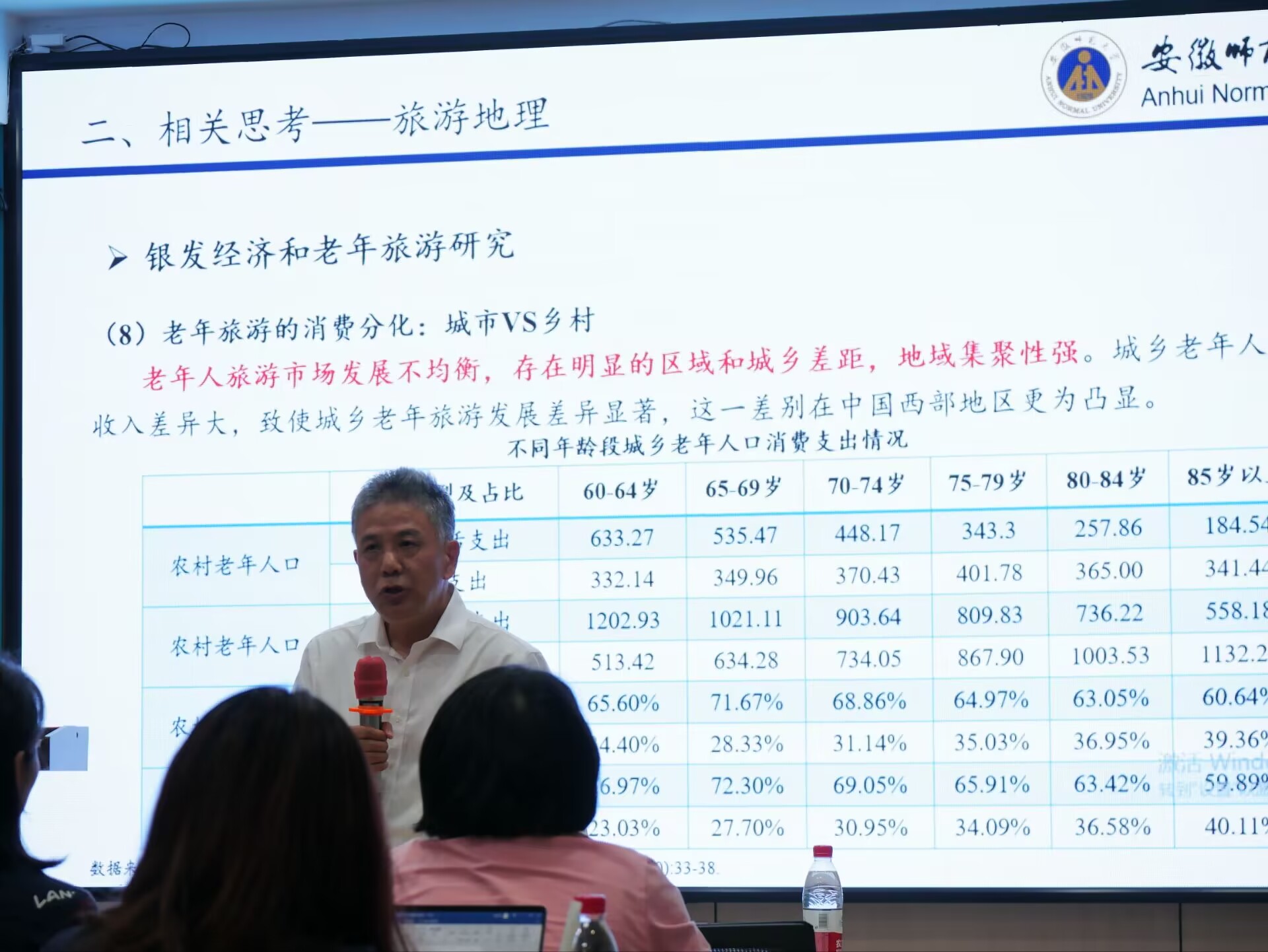 首先,陆林教授以地缘政治等内容引出人口地理问题,指出人口过程既是重要的要素过程,也是重要的背景性过程,快速的人口转变为地理学提供了一个思考入口。同时,陆林教授结合在东北、四川等地的旅游调查、老年旅游现状以及老年化现实,指出人口一般聚集在省会城市等社会经济规律。其次,陆林教授基于老龄化、幼儿园教育等现实问题对社会地理也做了思考,并结合团队调研情况简要介绍“老漂族”现象,以及与家庭关系、夫妻分离问题。最后,陆林教授以银发经济和老年旅游引出对旅游地理的见解,呼吁大家多关注人文社会现象的快速发展。