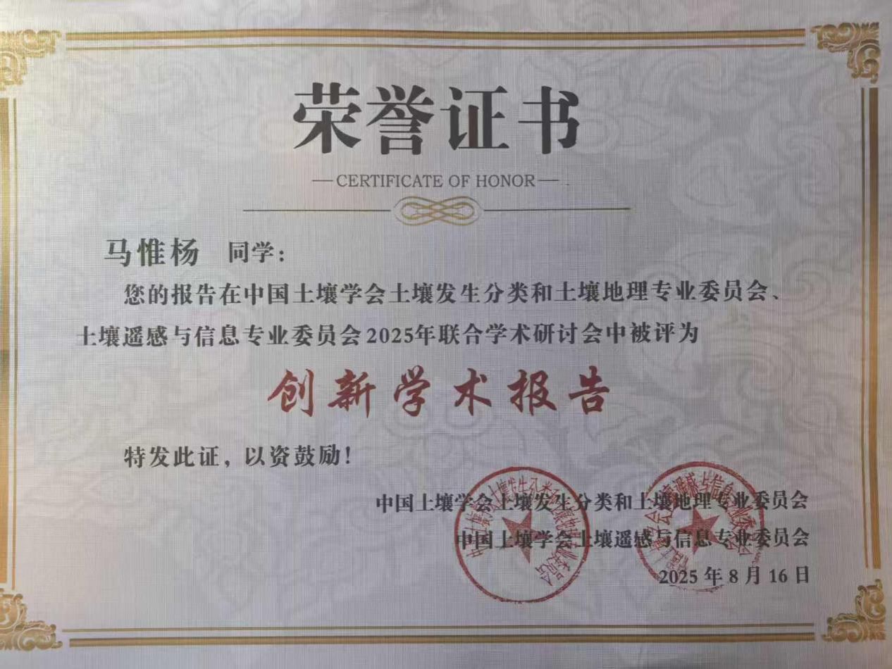 在我院于雷副教授的指导下,马惟杨在研讨会“土壤功能与土壤、土地评价”分会场作题为《基于遥感影像的江汉平原稻虾田时空格局变化与生态环境效应》现场报告,该报告获评“创新学术报告”,彰显了学院人才培养成效,以及学生扎实优秀的专业素养与锐意进取的精神面貌。