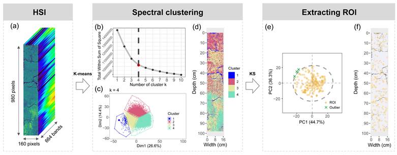 (d) 剖面中类别的可视化;(e) 利用 PCA 剔除 ROI 中的异常值;(f) 土壤剖面中 ROI分布的可视化