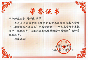 同时,周妤薇在2024年南京举办的“Global Symposium on Soil Information and Data”国际学术会议和“中国土壤学会第十五次全国会员代表大会暨第十三届海峡两岸土壤肥料学术交流研讨会”上分别作了英文和中文的现场口头报告,并获“研究生优秀报告奖”。
