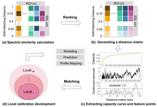 该研究针对 1 米深的完整土壤剖面,采用光谱相似性和连续统去除法(SS-CR)从全球土壤光谱库中构建了局地数据集(Local),并以光谱库全集(Global)作为对照。同时对比了偏最小二乘回归和随机森林算法在建立土壤剖面光谱与有机碳含量之间定量关系的能力。结果表明,使用随机森林构建的局部模型仅需全库样本的三分之一即可实现良好的预测精度,且精细绘制的土壤有机碳含量在剖面上的空间分布更合理。该研究凸显了成像光谱技术和局部建模法在土壤定量分析中的价值。