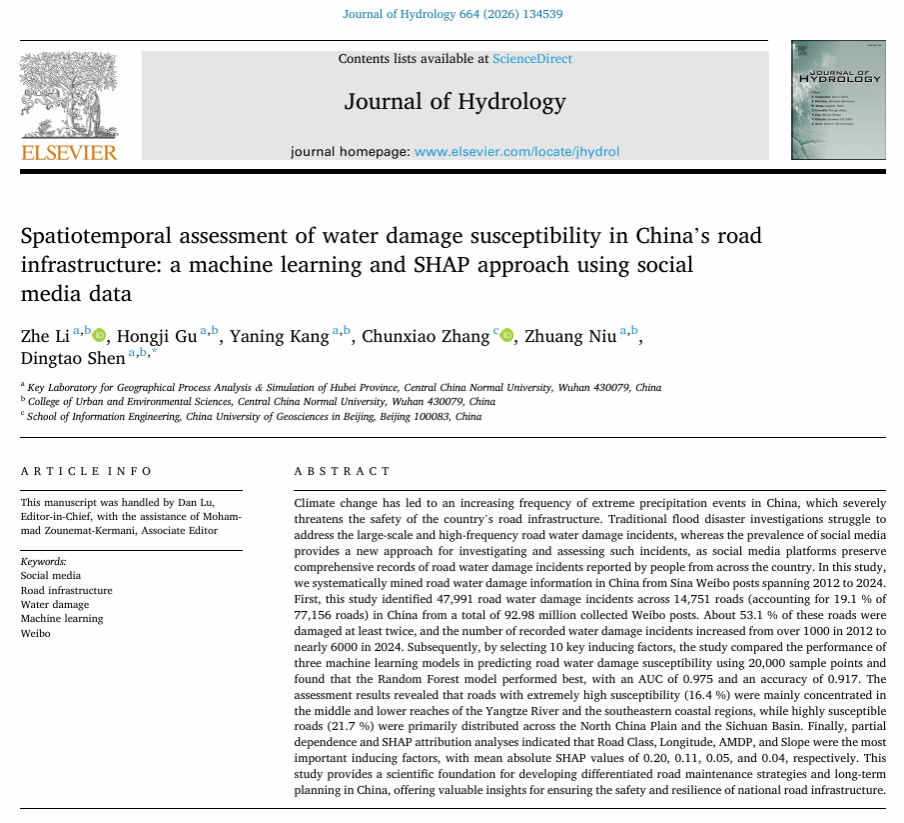 近日,我院2023级地理信息科学专业本科生李喆,在沈定涛副研究员的指导下,以第一作者身份在水文水资源领域国际权威期刊《Journal of Hydrology》(中科院一区Top)发表了题为“Spatiotemporal assessment of water damage susceptibility in China’s road infrastructure: a machine learning and SHAP approach using social media data”的研究论文,此论文是我院本科生本年度在《Journal of Hydrology》期刊上发表的第2篇论文。