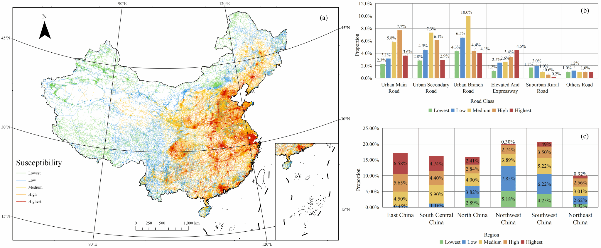 研究团队综合运用随机森林、支持向量机与人工神经网络三种机器学习算法进行易发性建模,结果显示随机森林模型表现最佳。进一步结合SHAP解释算法,揭示了道路等级、经度、最大日降水量及坡度是影响公路水损的关键因素,其中道路类型差异显著影响水损风险空间格局。研究结果为制定差异化道路养护策略、提升基础设施韧性提供了科学依据。该研究首次在全国尺度上利用社交媒体数据刻画公路水损事件的时空分布特征,展示了“社会感知数据+机器学习+可解释AI”的创新框架,为未来基于公众感知数据的灾害监测与防灾减灾研究提供了新思路。