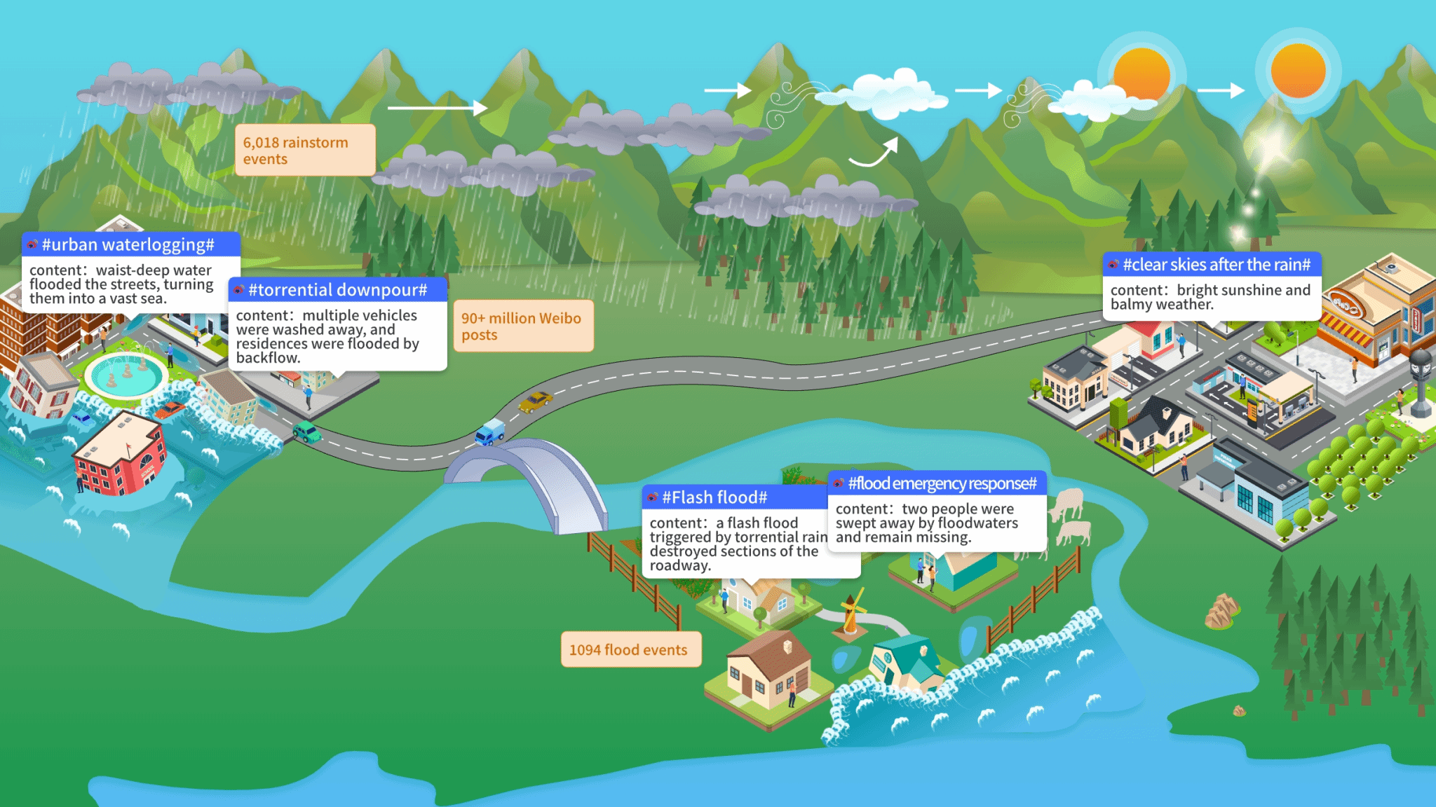 全球气候变化背景下,我国极端降水事件频发,洪涝灾害日益严重。传统洪水监测主要依赖卫星遥感与全球灾害数据库,存在事件遗漏严重、时空信息不精准等问题。研究团队创新性地整合了113,976景GSMaP卫星降水数据与9298万条新浪微博数据,通过面向对象方法识别出6018场暴雨事件,并进一步利用LDA主题模型与BERT深度学习模型,精准识别出1094次洪水事件。这一数量远超全球灾害数据库EM-DAT(114次)与DFO(45次)的记录。