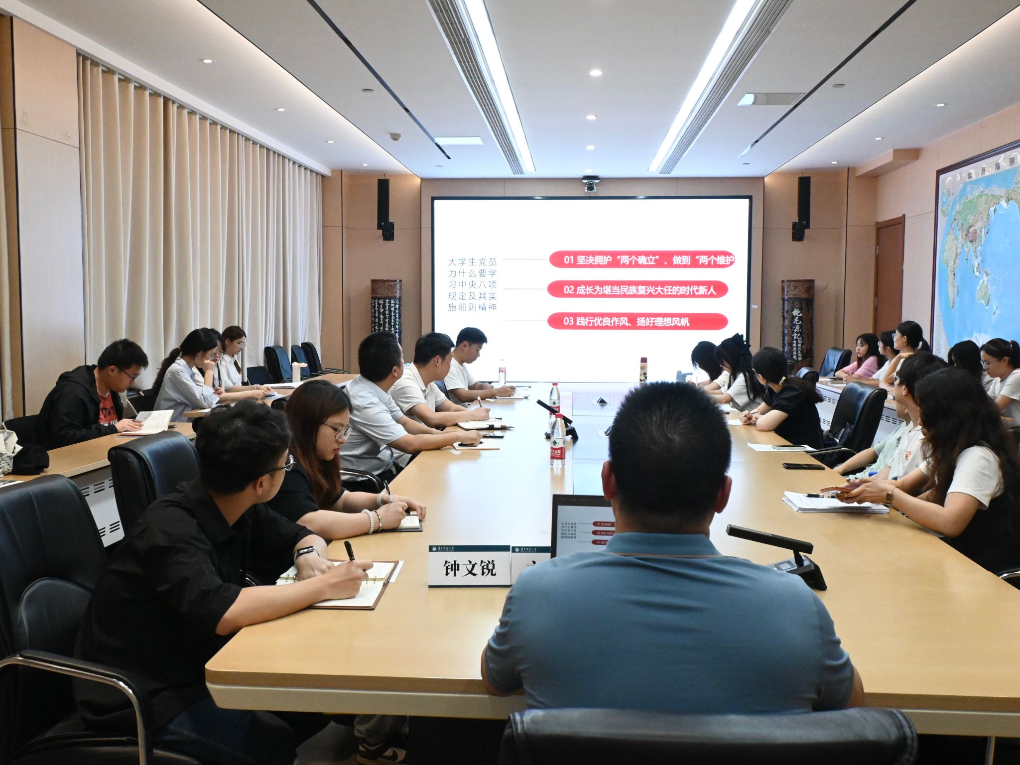 6月9日下午,校党委巡察办副主任钟文锐以《持续筑牢中央八项规定堤坝,以优良作风护航“理想之路”》为主题,在十号楼南楼609为城环学院师生党员讲授专题党课。院党委书记吴成峡、党委副书记李志雄及学院本科生第一党支部全体党员参加学习。