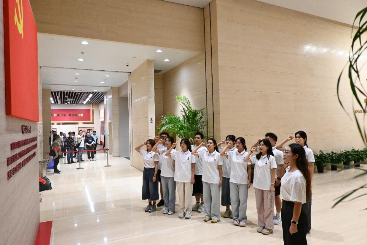 实践队首站抵达中共一大会址(兴业路76号),在讲解中回溯党的诞生历程。队员们依次参观主题展览,通过历史场景与珍贵史料,感悟先辈矢志不渝的奉献精神与英雄气概,深刻理解中共一大标志着党的正式诞生及确立民主革命纲领的重大意义。在宣誓墙前,全体队员面对党旗,重温入党誓词,胸前的党徽闪耀着信仰的光芒。