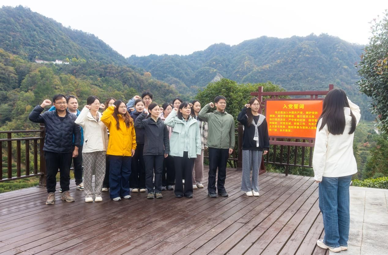 贺梦彤带领全体党员重温入党誓词,铿锵有力的誓言回荡在青山绿水之间,激励全体党员不忘初心、牢记使命,在实地实景中不断提升党性修养。