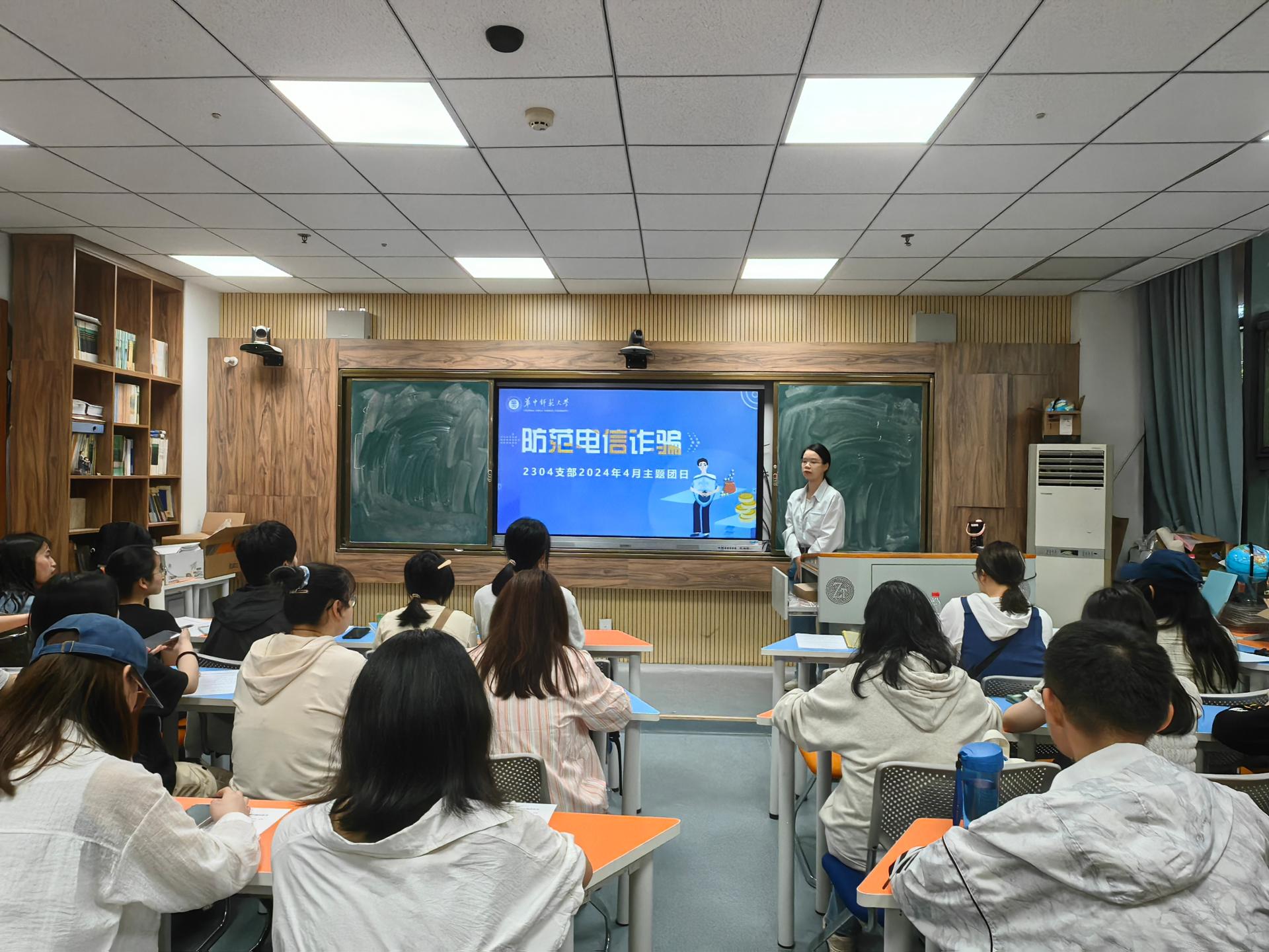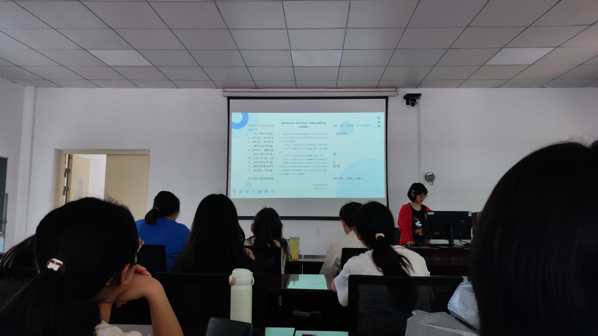 4月25日下午,2302班在学院402教室开展了防诈骗安全教育主题活动,活动由安全委员贺梦彤主持,班主任肖佳全程参与。贺梦彤向同学们分析讲解了大学校园内发生的真实电信诈骗案例,告诫大家要理性消费。本次防骗反诈主题班会内容丰富、贴合现实,讲解了新型诈骗的形式、手段和预防方法,帮助同学们掌握识别网络诈骗的技巧,提高防范诈骗的意识和能力,为营造安全稳定的校园环境,推进校园平安工作的深入开展贡献力量。