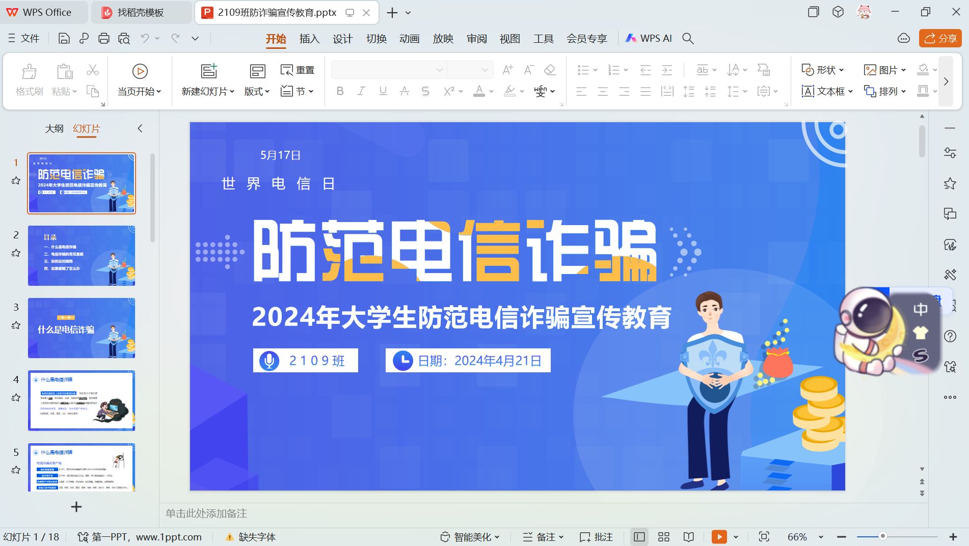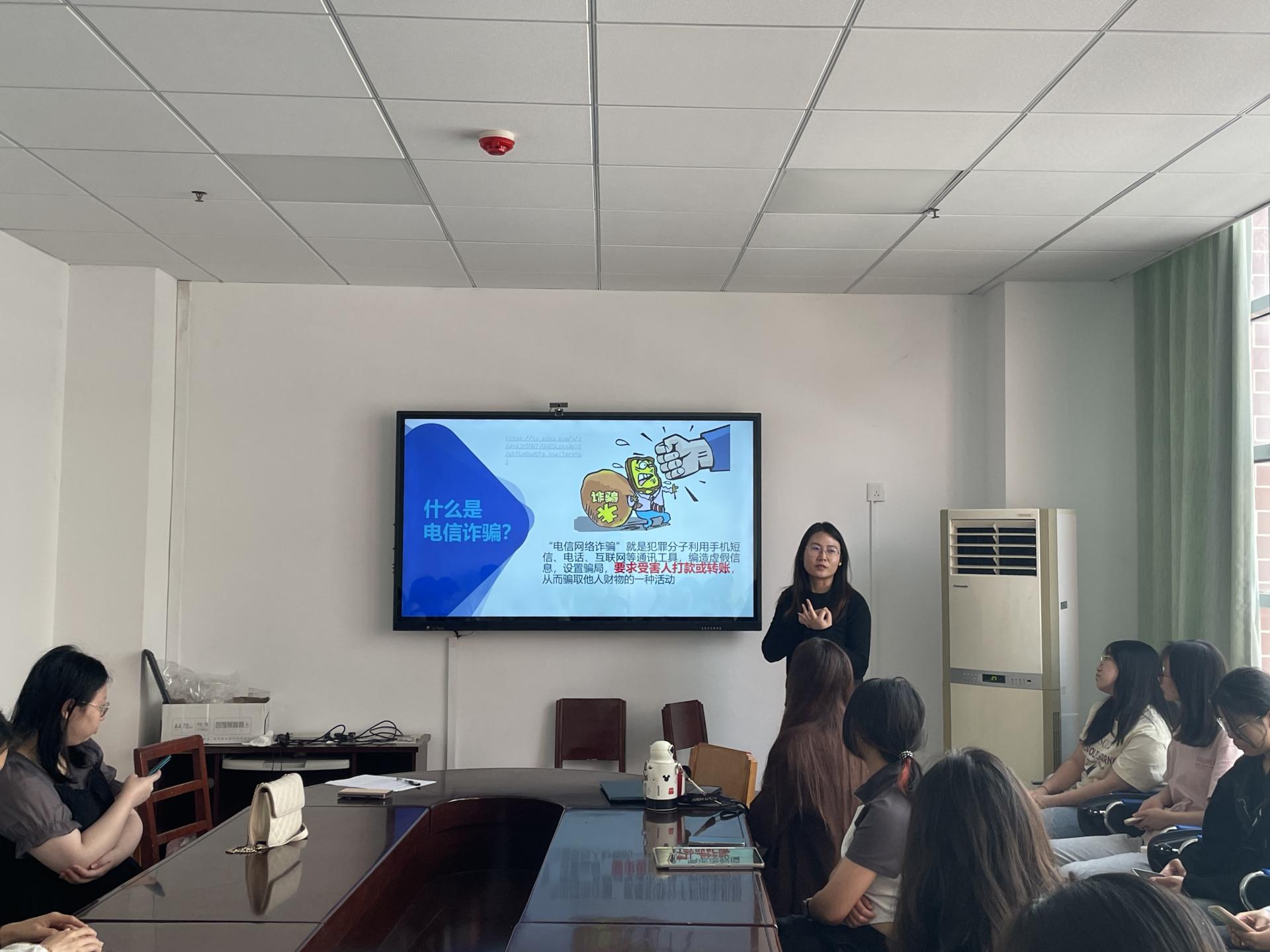 2107班于4月21日在十号楼402教室进行了防诈骗专题教育。班主任朱媛媛详细介绍诈骗手段,通过实例警醒同学们时刻保持警觉,增强防范意识。