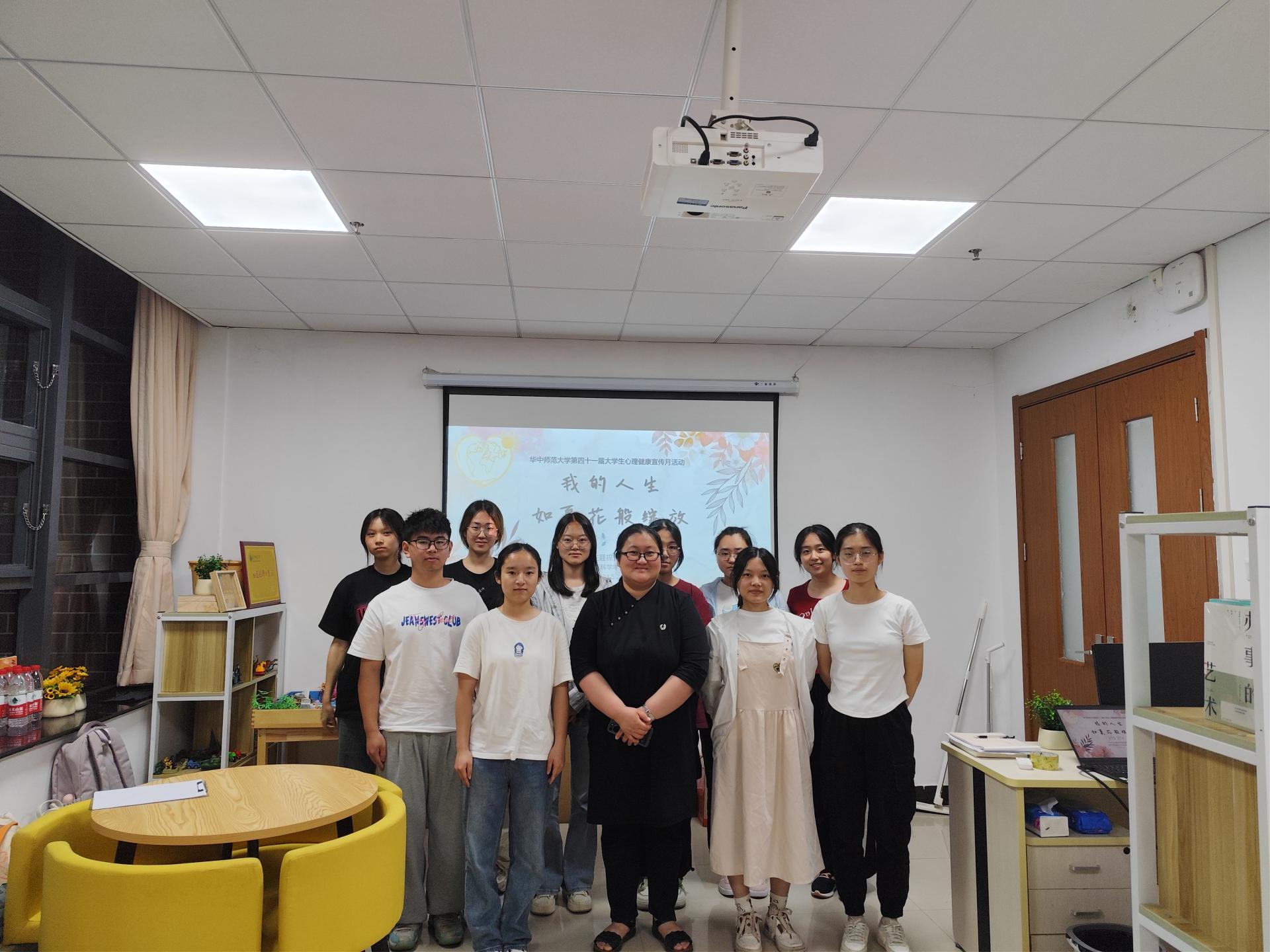 2024年5月22日,由华中师范大学大学生心理健康教育中心主办,城市与环境科学学院心晴驿站和经纬学习发展中心共同承办的“我的人生如夏花般绚烂”大学生生涯探索团体辅导活动,在十号楼401心晴驿站成功举办,本次团体的带领人为中国心理学会临床与咨询心理学注册系统注册心理师,国家二级心理咨询师,家庭治疗师,教育部“宏志助航计划”全国高校毕业生就业能力培训华中师范大学基地专家肖婷,活动共吸引11名同学报名参加。