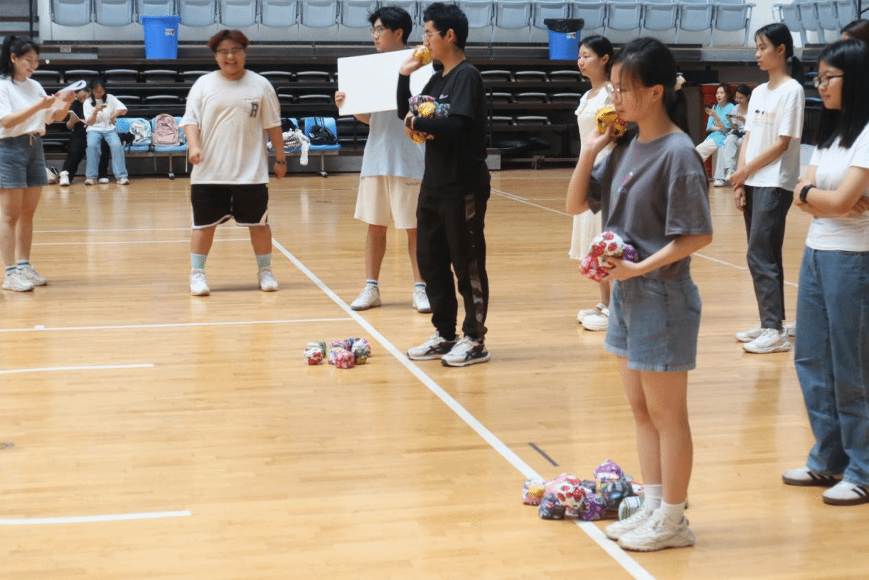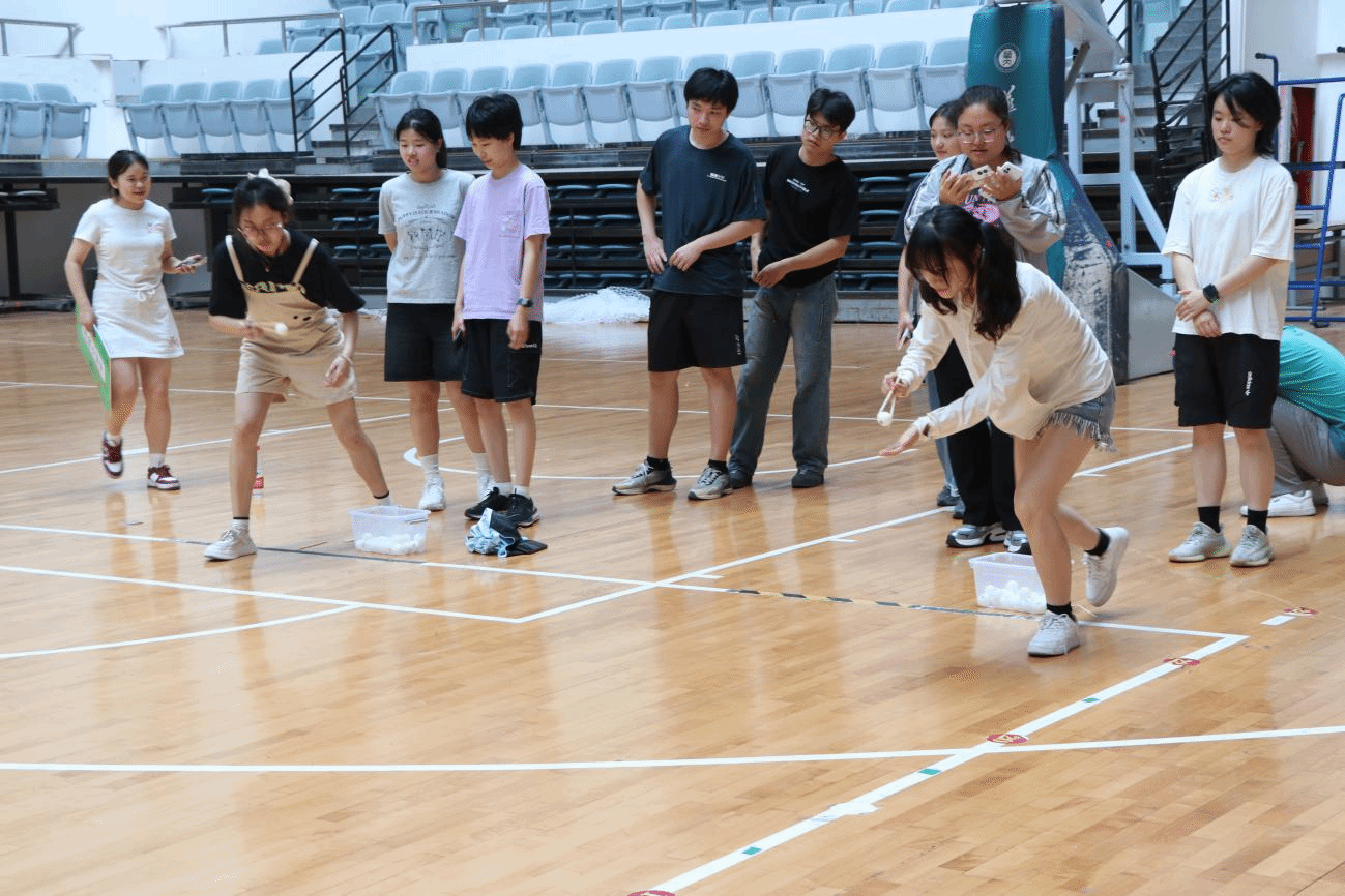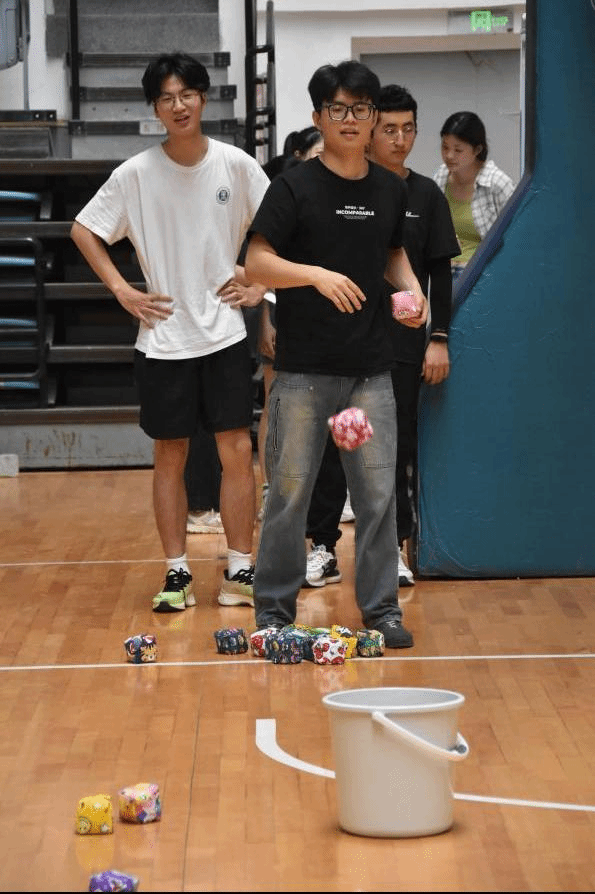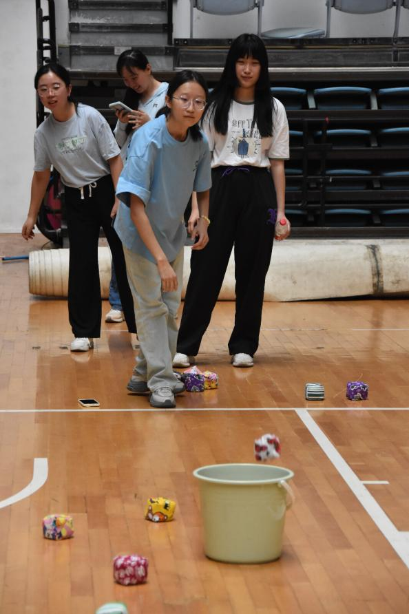 百发百中项目中,同学们需要在一定距离外投掷沙包,规定时间内投中数量最多者即可获胜。同学们瞄准目标,用沙包在空中画出一条条美丽的弧线。