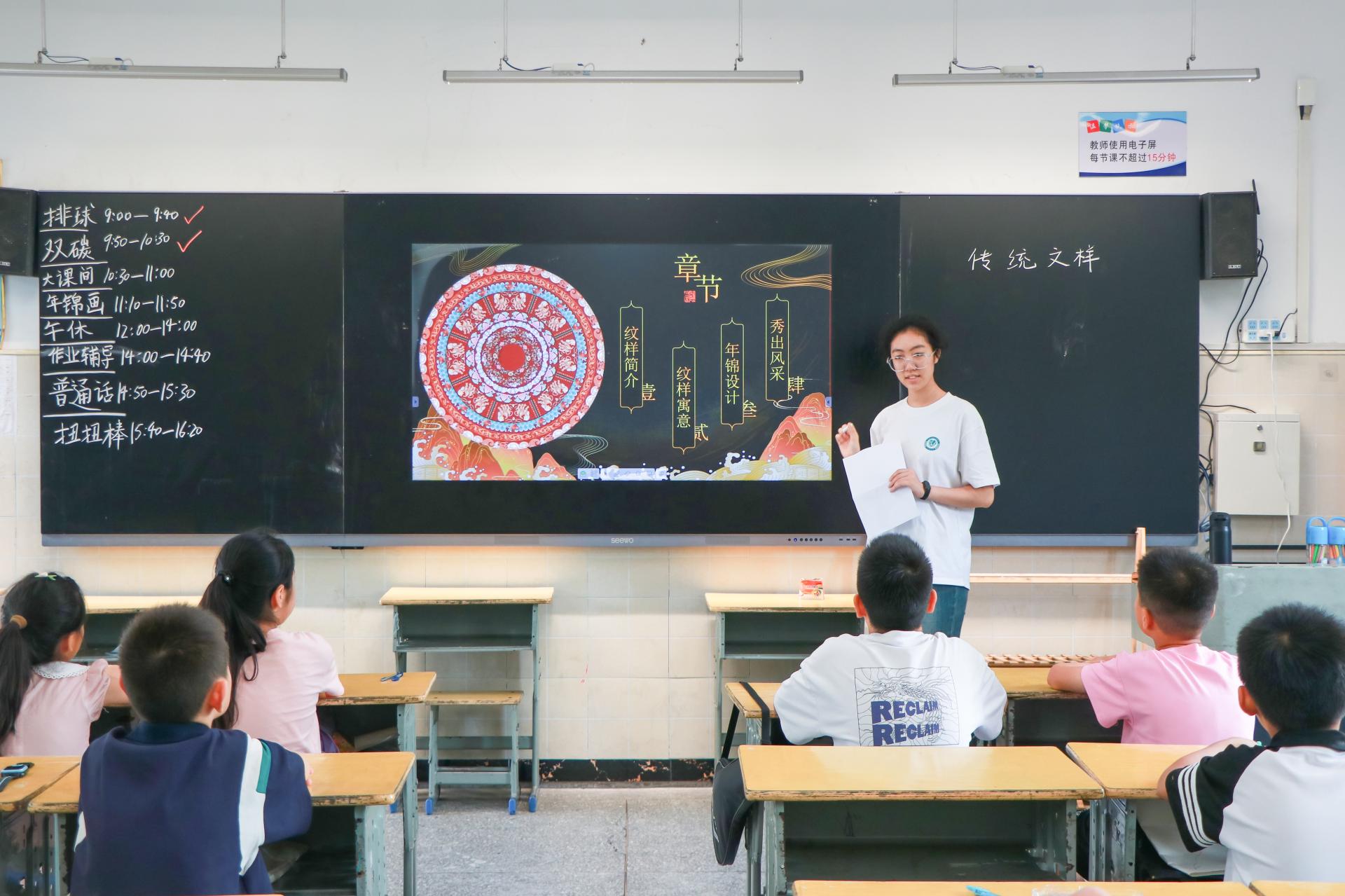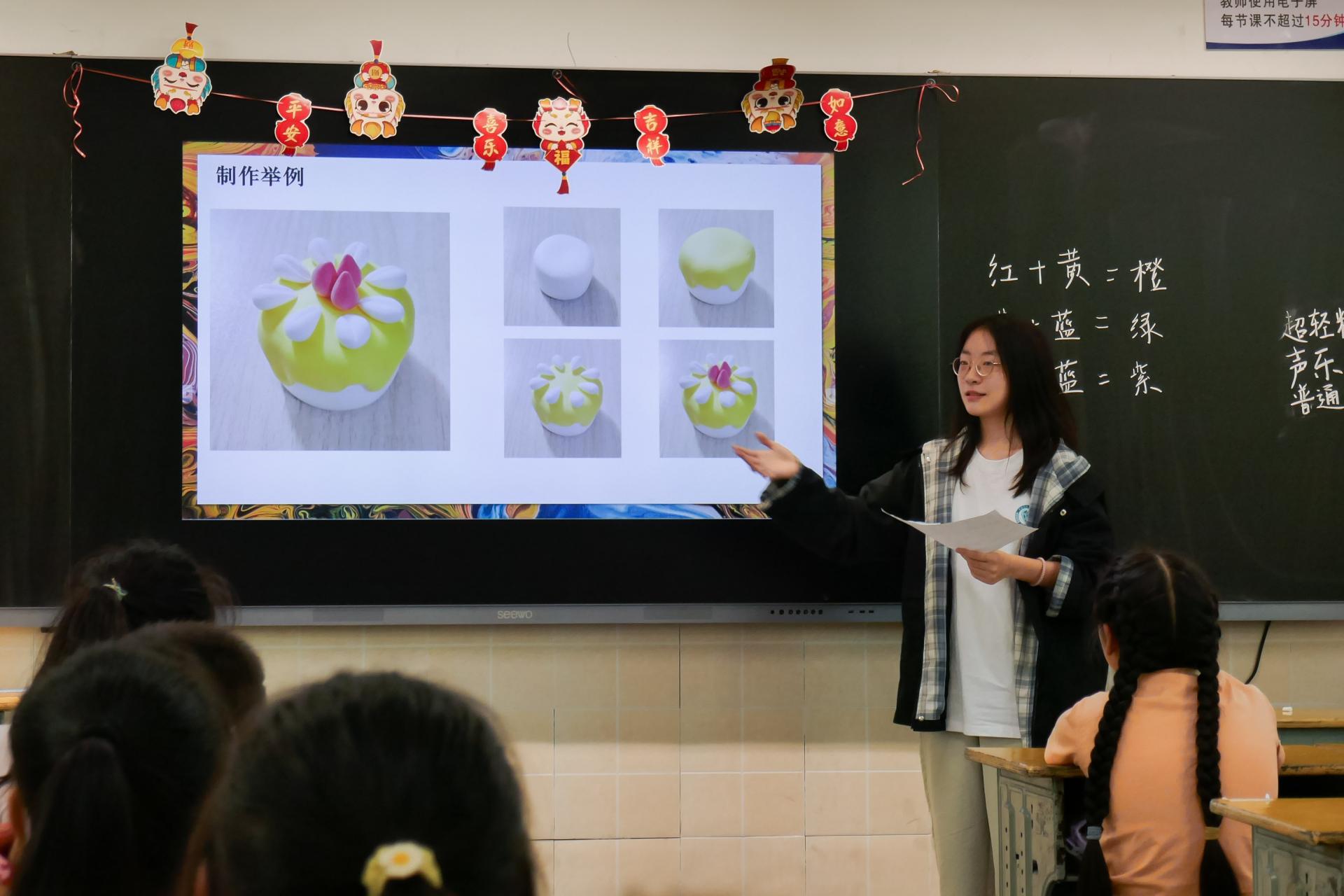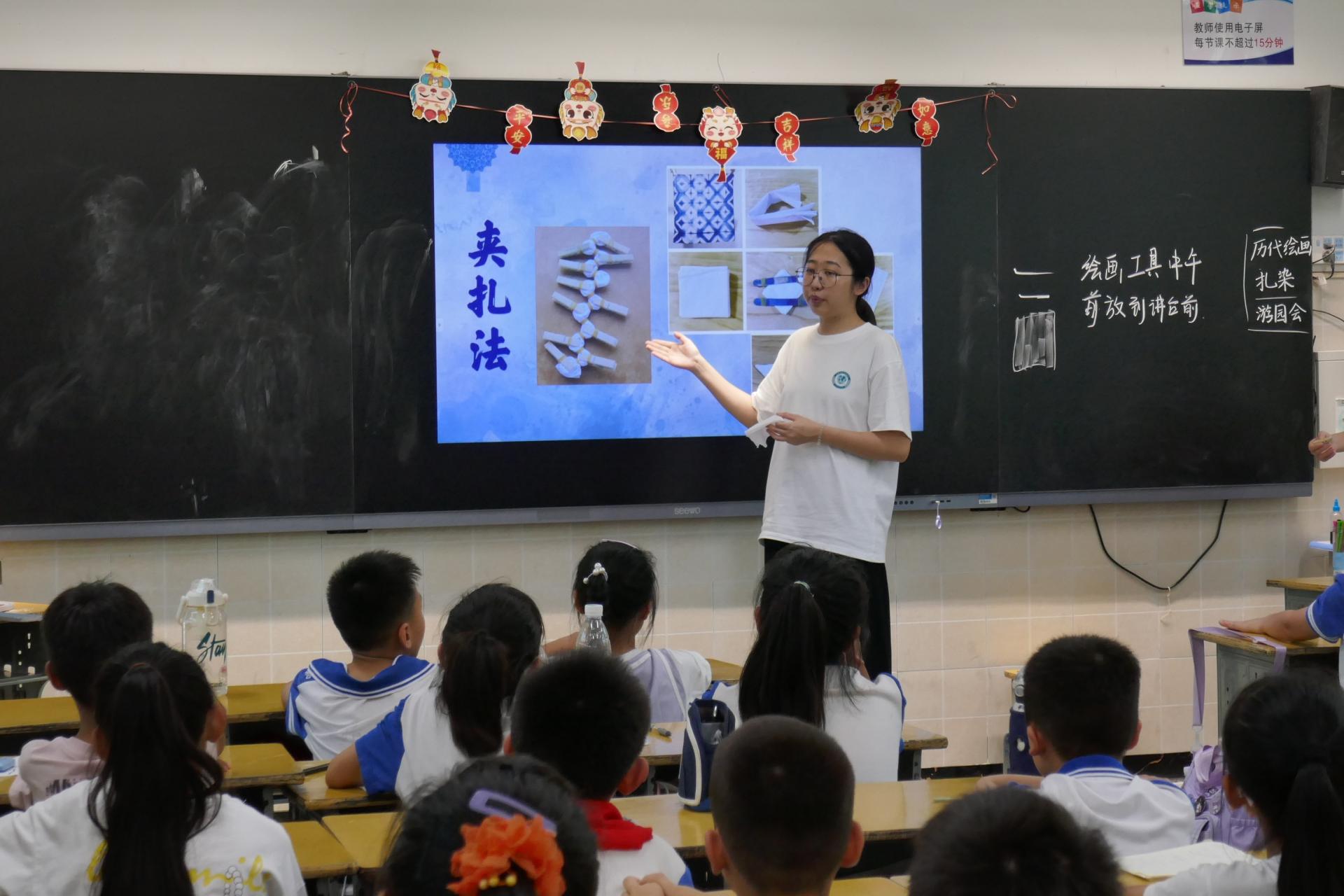 手工类课程包括创意手工,超轻黏土和扭扭棒,也包括文化类手工,扎染、年锦画以及历代绘画系列课程。超轻黏土课堂上,学生们在实践队员张佳颖的指导下,揉、捏、搓、压黏土,创造生动形象的作品,从憨态可掬的小动物到童趣可爱的卡通人物,每一幅作品都凝聚了学生的创意和努力。在扎染课上,实践队员辛静微向学生介绍扎染技艺的原理,带领学生动手体验扎布、捆结、配色、染布等过程,创造出色彩斑斓、图案各异的扎染作品,让学生们近距离感受到中华优秀传统文化的魅力。