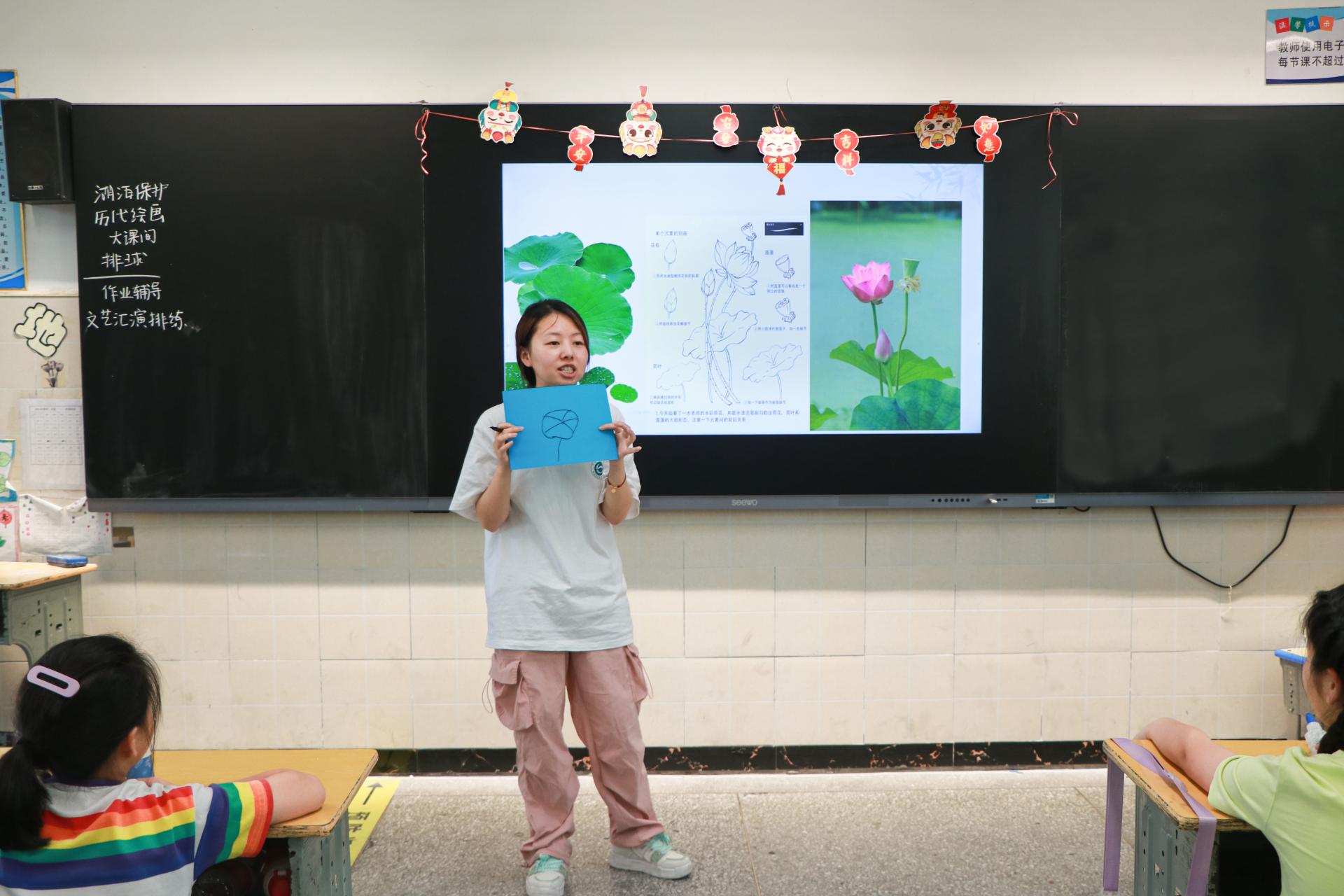 实践队员杨菁负责历代绘画系列课程的讲授,向学生们讲解中国画的基础知识,包括“文房四宝”、墨的形状与表达、色彩搭配等相关内容,增强学生对国画知识的理解。课堂上,杨菁以水墨画和彩线贴画两种形式鼓励学生们进行创作,学生用秀丽笔晕染出国宝熊猫和墨竹,打造一片自己的水墨武林;用彩线卷绕缠贴,勾勒出亭亭玉立的荷花与碧绿田田的莲叶。
