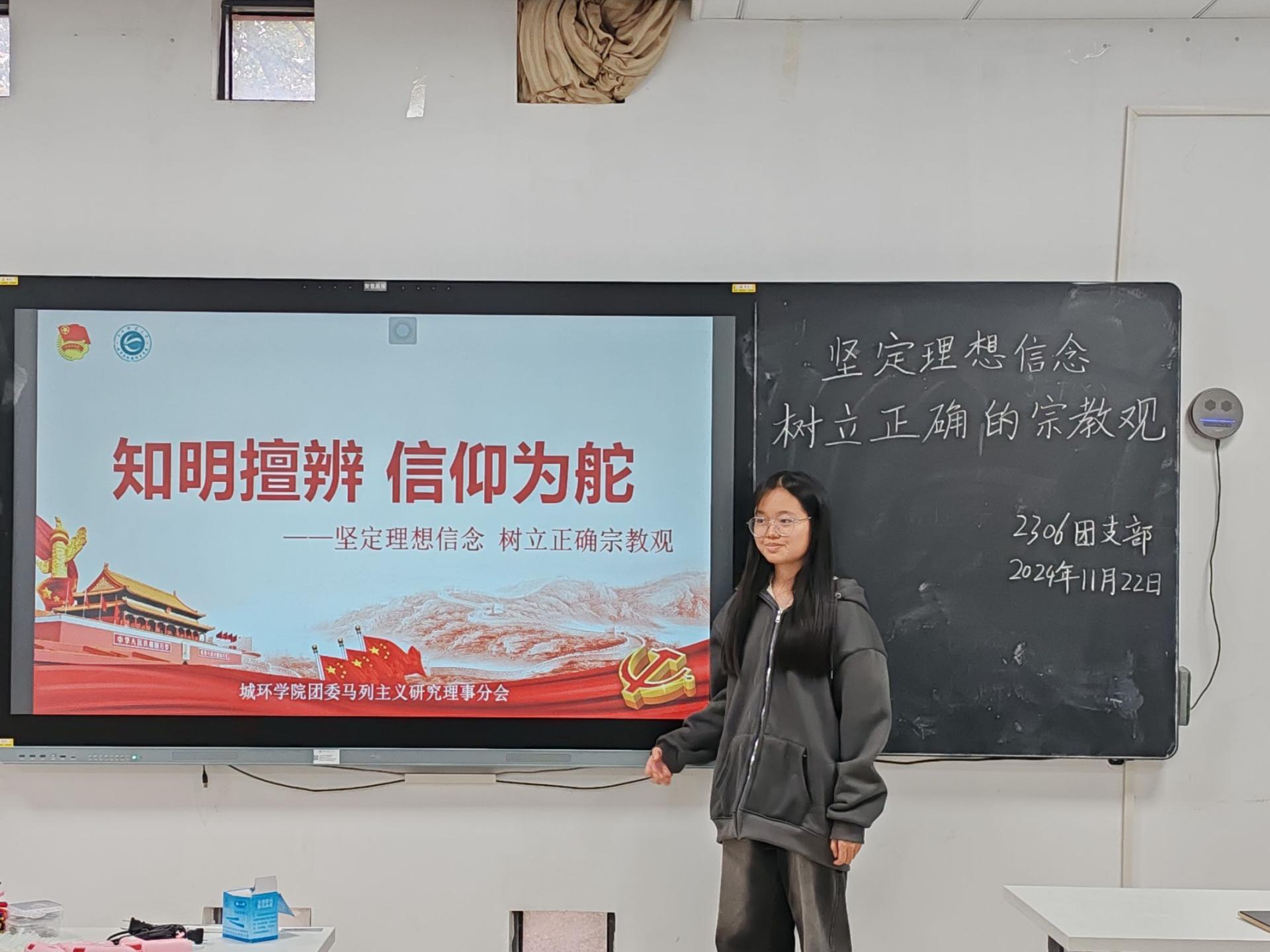 11月22日,2306班于十号楼南楼402教室开展“坚定理想信念,树立正确宗教观”主题团日活动。此次活动由团支书陈梦娴同学主持,学院马列主义研究理事分会成员覃茵开展宣讲活动。