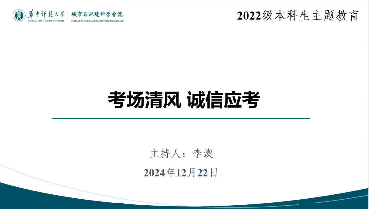 为加强学风建设,严肃考风考纪,树立诚信意识,营造公平公正的考试环境,2024年12月22日,城环学院各年级在九号楼9201教室开展“诚信考试,从我做起”主题教育活动。