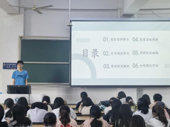 张成铭从“现实案例警示”“行为规范界定”“案例深度解析”“危害层级剖析”“华师处分细则”“如何遵纪守法”六个方面展开介绍。他以高校中常见的典型违纪案例为切入点,深入剖析违纪行为的根源与后果,同时明确学校各项行为规范,帮助同学们清晰界定纪律边界。在详细解读华师处分细则后,他结合实际,倡导同学们在日常学习生活中要自觉遵守纪律。刘新星老师在活动最后指出,同学们要严格遵守学校规章制度,将纪律要求内化于心、外化于行。